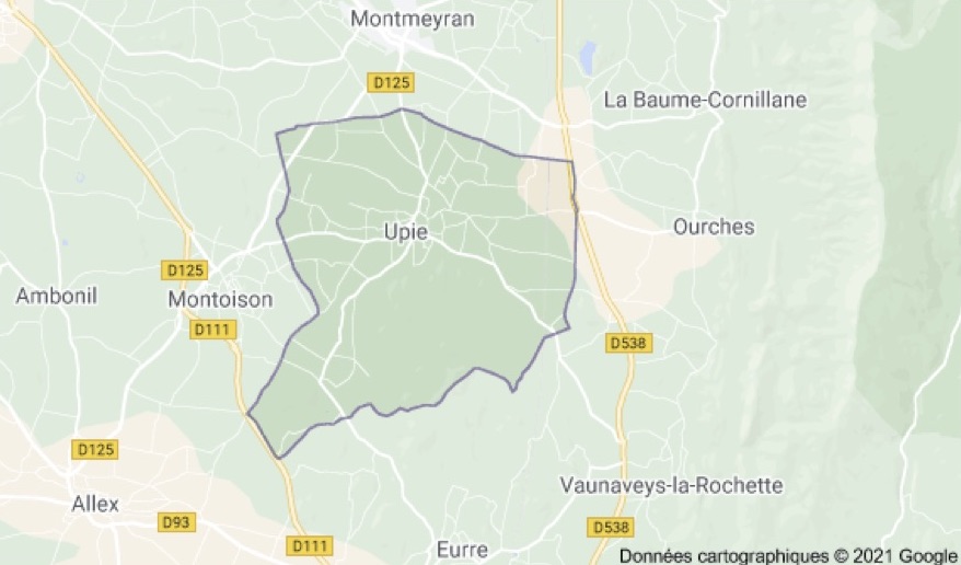 La commune d’Upie est située dans la vallée du Rhône (Drôme, région Auvergne-Rhône-Alpes),